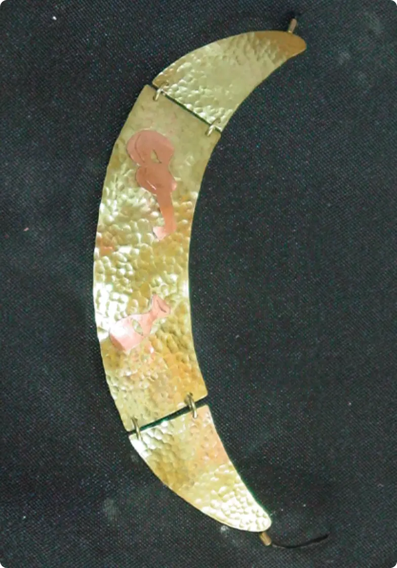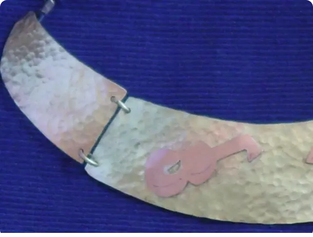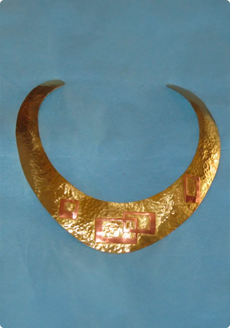 Gargantilla en latón martelado con adornos cubistas de cobre.