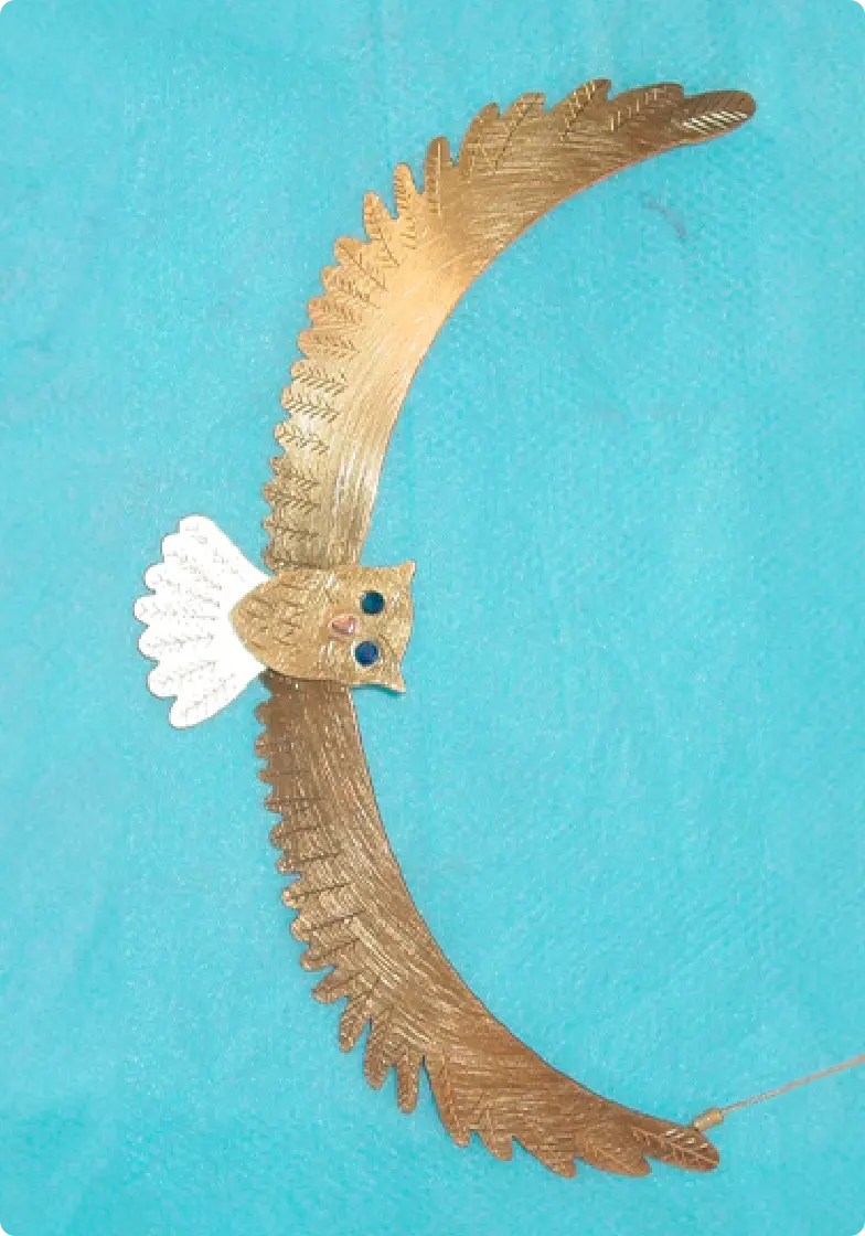 Gargantilla en laton, los detalles del plumaje grabados con buril. Modelo para realizar en plata por encargo.