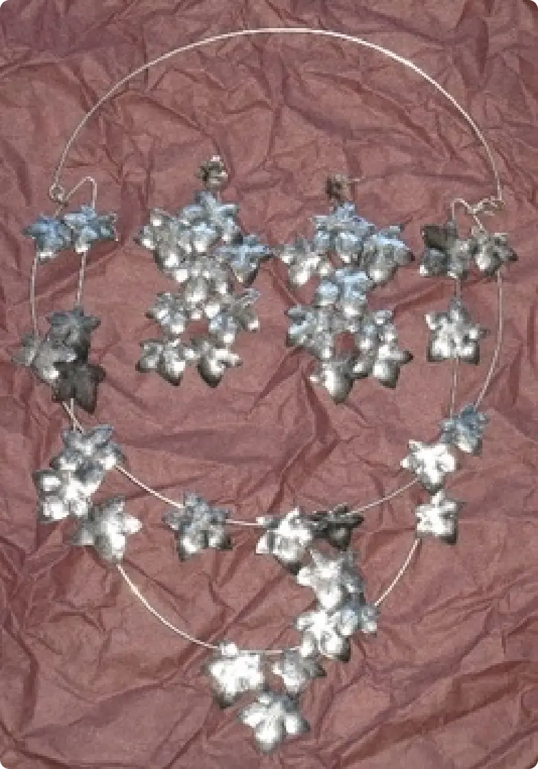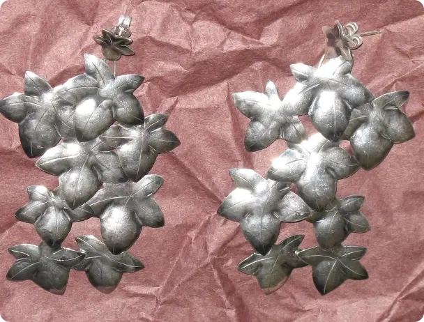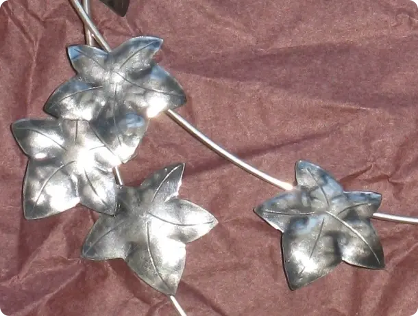 Hojas con volumen, plata oxidada y detalles a buril.